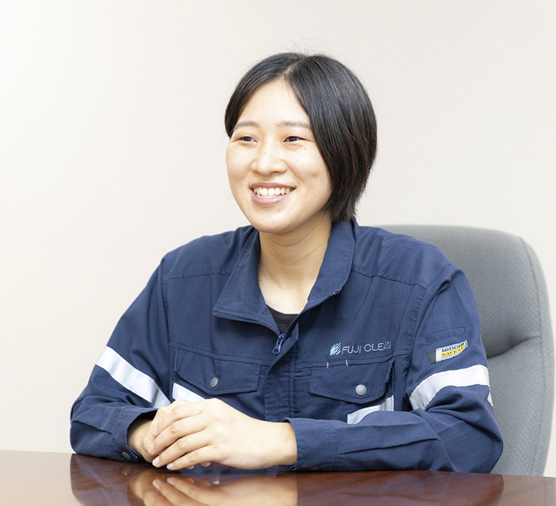 「乾式メタン発酵施設」の中央操作室で施設の稼働状況を確認したり、現場でフォークリフトを操作して廃棄物を運んだりしています。廃棄物はコンベヤーでメタン発酵槽へと運ばれますが、途中で廃棄物が詰まることもあります。トラブルの未然防止に努めると同時に、トラブル発生時にはすぐに対応できるよう普段から広い視野を持つよう心掛けています。先輩方は年も近く、個性豊かな人が多いので、人生相談に乗ってもらうこともあります。